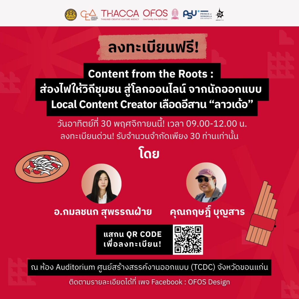 ขอเชิญทุกท่าน เปิดประสบการณ์ผ่าน “Case Study Inspiration – Content from the Roots: ส่องไฟให้วิถีชุมชน สู่โลกออนไลน์” จากนักออกแบบ Local Content Creator เลือดอีสาน “ลาวเด้อ”เข้าร่วมฟรี! ไม่มีค่าใช้จ่าย