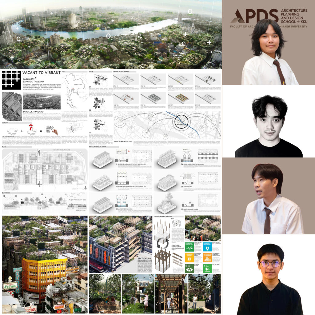 ขอแสดงความยินดีกับ นักศึกษาคณะสถาปัตยกรรมศาสตร์ มหาวิทยาลัยขอนแก่น ประกอบด้วย นายพสธร กีฬา นายสุทธิพงค์ คามทิตย์ นายวุฒิชัย โคตรชา และนายชญานนท์ ชิณวงค์ ได้ผ่านการคัดเลือกระดับประเทศเข้าร่วมการประกวดแบบโครงการ ARCASIA Students’ Design Competition 2025 ในระดับเอเชียด้วยผลงาน ชื่อว่าVacant to Vibrant ที่มุ่งแก้ไขปัญหาการใช้ประโยชน์จากตึกแถวในเมืองไทยให้เกิดคุณค่าสูงสุด