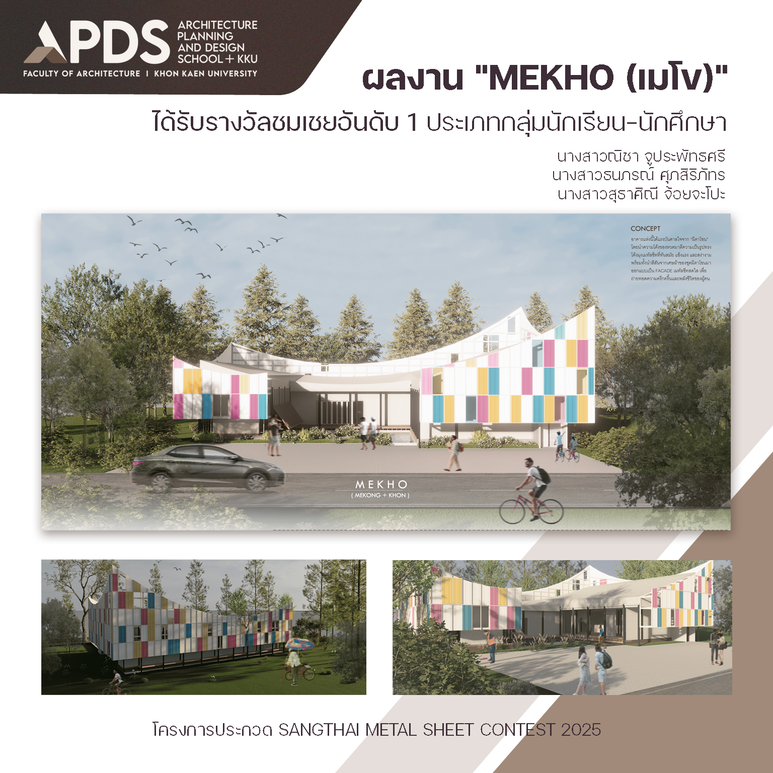 คณะสถาปัตยกรรมศาสตร์ มหาวิทยาลัยขอนแก่น ขอแสดงความยินดีกับนักศึกษา ที่ได้รับรางวัลชมเชยอันดับ 1 ประเภทกลุ่มนักเรียน-นักศึกษา จากการประกวดออกแบบสิ่งปลูกสร้างจากเมทัลชีท “SANGTHAI METAL SHEET CONTEST 2025” ภายใต้คอนเซปต์ “สิ่งปลูกสร้างเจนใหม่ ดีไซน์ได้ด้วยเมทัลชีท” จัดโดยบริษัท แสงไทยเมทัลชีท โดยประกาศผลเมื่อวันที่ 30 ตุลาคม 2568