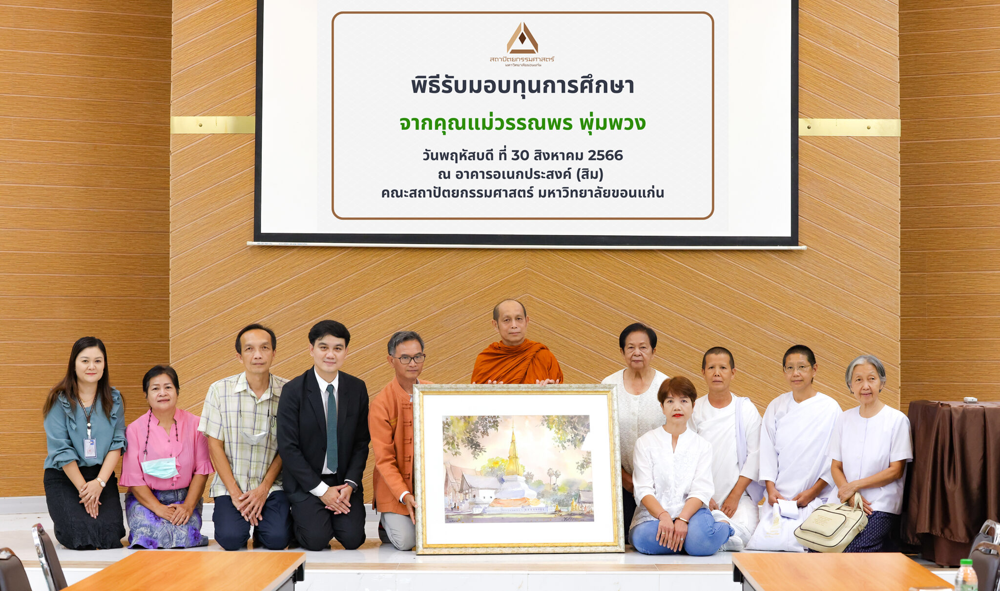 เมื่อวันที่ 30 สิงหาคม 2566 รศ.ดร.ชูพงษ์ ทองคำสมุทร คณบดี พร้อมทั้งผู้บริหารคณาจารย์และเจ้าหน้าที่ คณะสถาปัตยกรรมศาสตร์ มหาวิทยาลัยขอนแก่น ให้การต้อนรับคณะผู้บริจาคทุนการศึกษา โดยทุนนี้บริจาคโดยคุณแม่วรรณพร พุ่มพวง ซึ่งมีท่านพระครูฉันทธรรมานุรักษ์ (พระอาจารย์สุภาพ ฉันทชาโต) ต.โคกสี อ.สว่างแดนดิน จ.สกลนคร เป็นผู้แทนในการมอบทุน เพื่อเข้ากองทุนส่งเสริมการผลิตบัณฑิตคณะสถาปัตยกรรมศาสตร์ โดยท่านได้บริจาคทุนในครั้งนี้เป็นจำนวนเงิน 100,000 บาท รวมกับในส่วนเดิมที่คุณแม่วรรณพร พุ่มพวง เคยได้บริจาคไว้ในกองทุน พนวรรธ พุ่มพวง กว่า 510,000 บาท