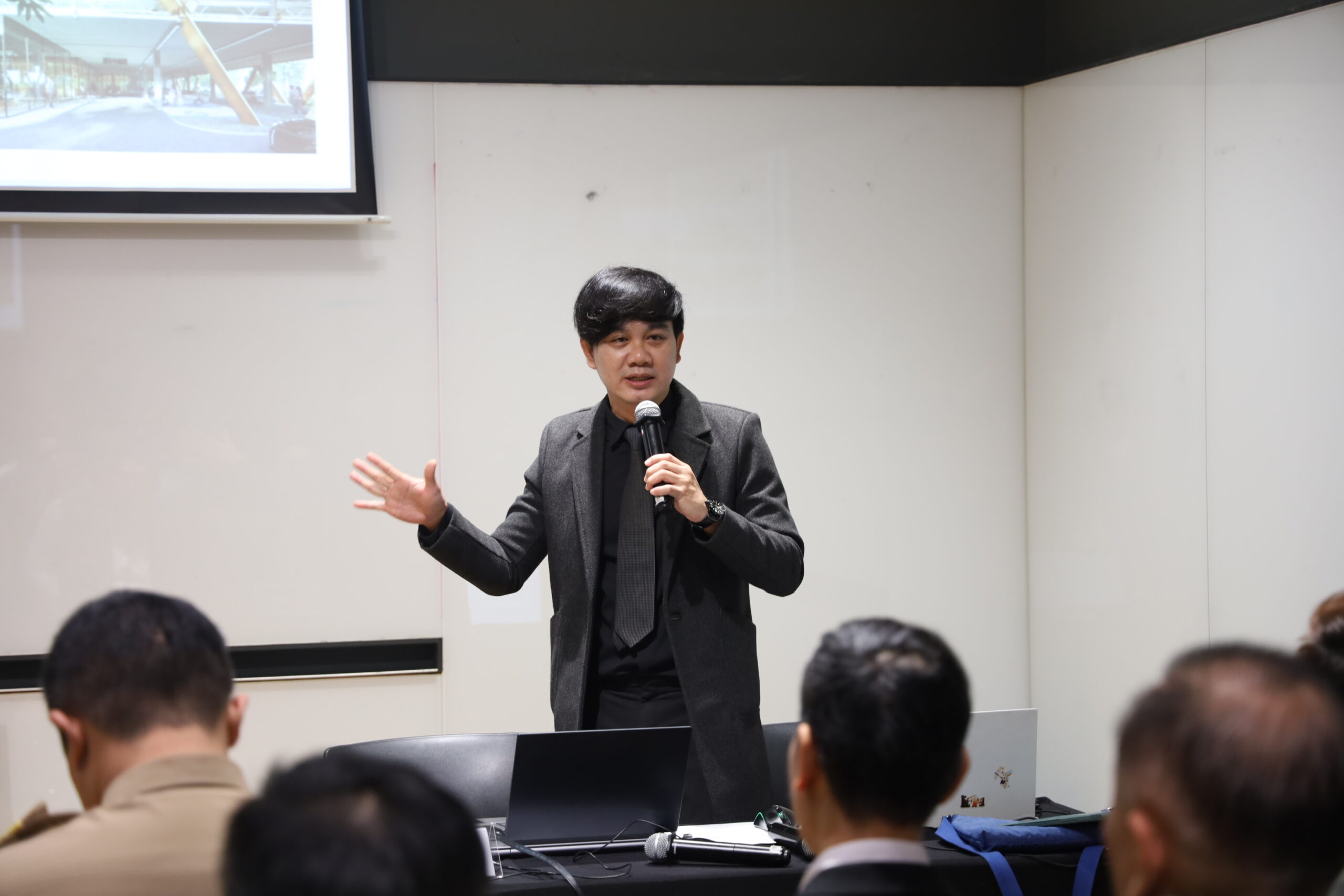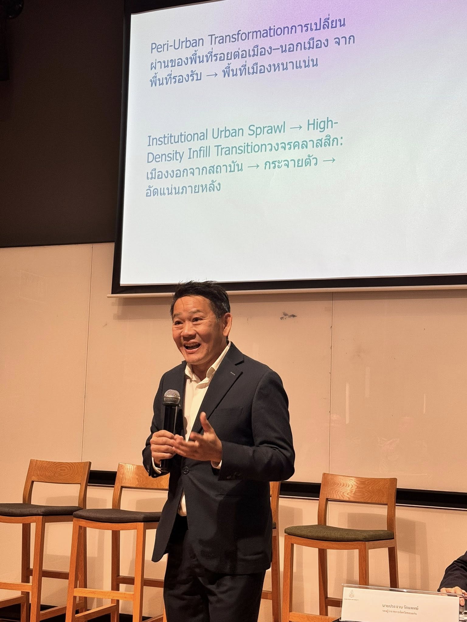 ในการประชุมครั้งนี้ รองศาสตราจารย์ ดร.กฤตภัทร ถาปาลบุตร คณบดีคณะสถาปัตยกรรมศาสตร์ ได้บรรยายเรื่องแนวทางการบูรณาการพัฒนาเศรษฐกิจที่เกี่ยวเนื่องกับการแพทย์และการบริการสุขภาพ ครอบคลุมมิติด้านกายภาพ อาคาร สาธารณูปโภค การสัญจร พลังงาน พื้นที่สาธารณะ พื้นที่สีเขียว สิ่งแวดล้อม มลภาวะ และการมีส่วนร่วมของทุกภาคส่วนในเขตนวัตกรรมการแพทย์ขอนแก่น ขณะที่ รองศาสตราจารย์ ดร.ชูพงษ์ ทองคำสมุทร ในฐานะรองอธิการบดีฝ่ายกายภาพและสิ่งแวดล้อม มหาวิทยาลัยขอนแก่น ได้นำเสนอโครงการปรับปรุงกายภาพและโครงสร้างพื้นฐานภายในพื้นที่มหาวิทยาลัยที่กำลังดำเนินการและจะดำเนินการในอนาคต พร้อมด้วย รองศาสตราจารย์ ดร.รวี หาญเผชิญ คณาจารย์ประจำหลักสูตรดุษฎีบัณฑิตการวิจัยบูรณาการด้านการออกแบบ สถาปัตยกรรมและการวางผังเมือง ได้บรรยายถึงพัฒนาการของย่านกังสดาลตั้งแต่ยุคการตั้งชุมชนจนถึงปัจจุบัน นอกจากนี้ ผู้ช่วยศาสตราจารย์ ดร.ปัทมาภรณ์ วงศ์วิริยะ รองคณบดีฝ่ายแผนยุทธศาสตร์และประธานหลักสูตรการวางแผนภาคและเมืองมหาบัณฑิต ยังได้นำนักศึกษาในหลักสูตรเข้าร่วมเสวนาในครั้งนี้ด้วย