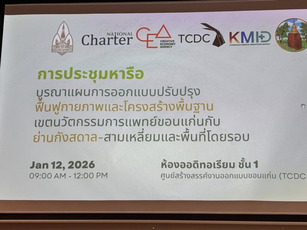 เมื่อวันที่ 12 มกราคม 2569 เวลา 9.00-12.00 น. ณ ห้องออดิทอเรียม ชั้น 1 สำนักงานเศรษฐกิจสร้างสรรค์ขอนแก่น (CEA Khon Kaen) คณาจารย์คณะสถาปัตยกรรมศาสตร์ มหาวิทยาลัยขอนแก่น (APDS KKU) ได้เข้าร่วมกิจกรรม “การประชุมหารือบูรณาการแผนการออกแบบปรับปรุงฟื้นฟูกายภาพและโครงสร้างพื้นฐาน เขตนวัตกรรมการแพทย์ขอนแก่นกับย่านกังสดาล–สามเหลี่ยม และพื้นที่โดยรอบ” ซึ่งจัดขึ้นโดยความร่วมมือระหว่างศูนย์บริหารเวลเนสและเขตนวัตกรรมทางการแพทย์ มหาวิทยาลัยขอนแก่น สมาคมการผังเมืองไทยและกฎบัตรไทย และ CEA Khon Kaen