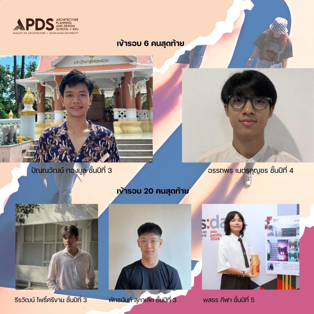 ซึ่งตัวแทนนักศึกษาที่ผ่านเข้ารอบ Finalist มี 2 ผลงาน ได้แก่ นายอรรถพร เนตรกุญชร นักศึกษาชั้นปีที่ 4 จากผลงาน HIEROPHANY และนายปัณณวัฒน์ ทองมูล นักศึกษาชั้นปีที่ 3 เจ้าของผลงาน PIA Craft Yard: Converging the Rice Weaves Legacies โดยทั้งสองผลงานต่างได้รับรางวัล Bronze Award พร้อมเงินรางวัล 4,000 บาท และรางวัล A5 Best Design พร้อมเงินรางวัล 5,000 บาท ผลงานละ 2 รางวัล นอกจากนี้ยังมีนักศึกษาที่เข้ารอบ 20 ผลงานสุดท้าย ได้เข้าร่วมรับประกาศนียบัตร Architectural Qualification อีก 3 ท่าน ประกอบด้วย นายพสธร กีฬา กับผลงาน In Mine Memories นายพัทธนันท์ สุภาเลิศ กับผลงาน ต่อเรือ ต่อวิถีแห่งสายน้ำ และนายธีรวัฒน์ โพธิ์ศรีขาม กับผลงาน Treads of Wisdom: Creating Fabric from the Community’s Way of life