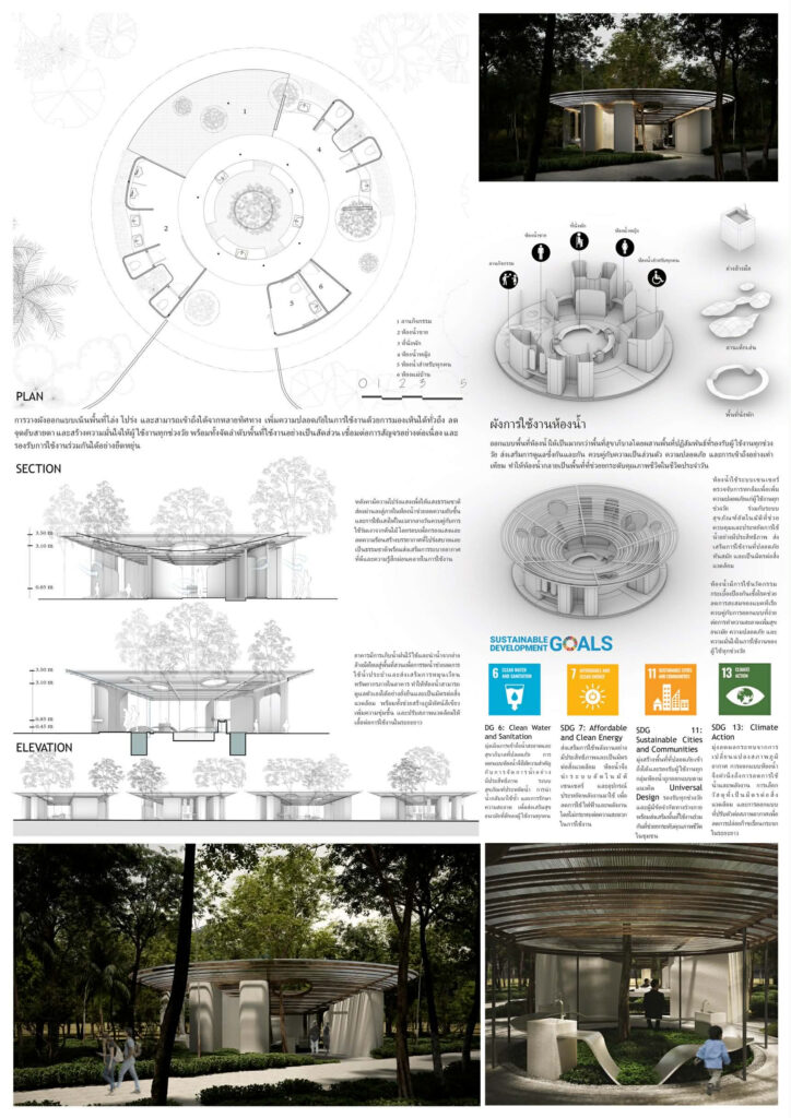 นายชญานนท์ ชิณวงค์ ตัวแทนทีมผู้ชนะเลิศ เผยถึงแนวคิดการออกแบบที่โดดเด่นและสร้างสรรค์ในการออกแบบว่า ห้องน้ำสาธารณะในปัจจุบันมักถูกมองว่าเป็นพื้นที่อับสายตา ขาดการดูแล และก่อให้เกิดความไม่มั่นใจด้านความปลอดภัย โดยเฉพาะแก่เด็ก ผู้สูงอายุ และผู้หญิง ภาพลักษณ์เชิงลบนี้เกิดจากการออกแบบที่ปิดทึบ ขาดแสงสว่าง การระบายอากาศที่ไม่เพียงพอ และมีจุดอับสายตาที่อาจนำไปสู่กิจกรรมที่ไม่พึงประสงค์