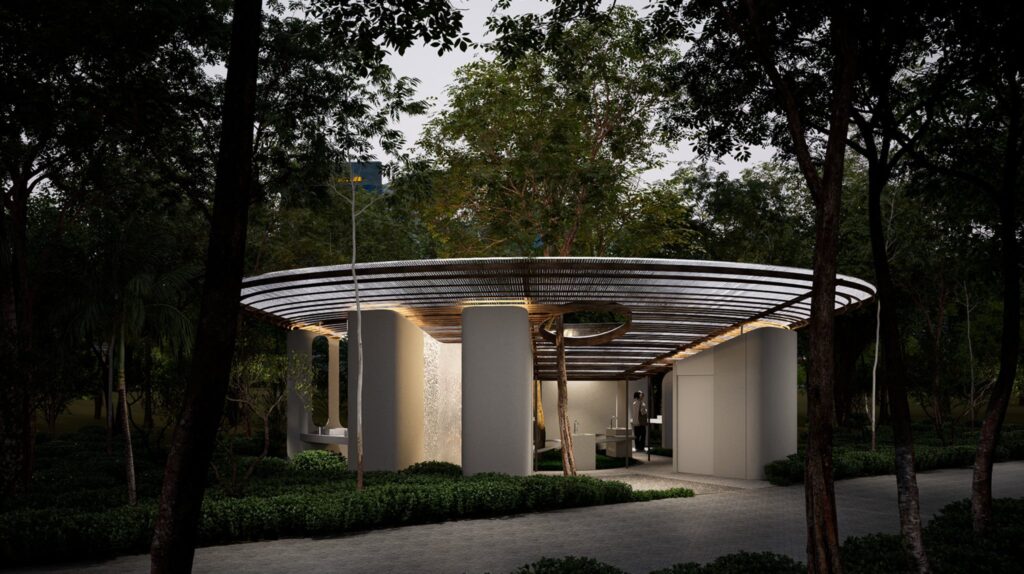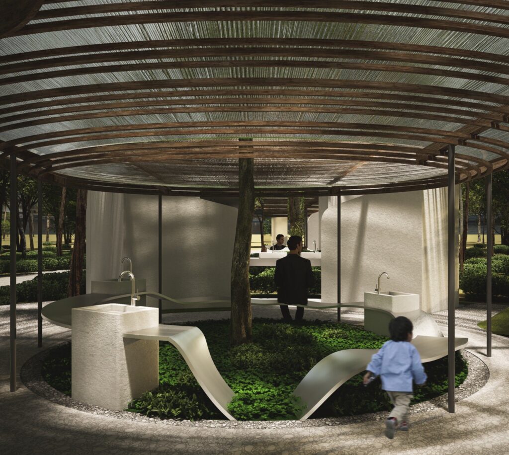 การออกแบบที่เปิดโล่งนี้ยังช่วยให้แสงธรรมชาติและการระบายอากาศไหลผ่านเข้าสู่ทุกส่วนของห้องน้ำได้อย่างทั่วถึง ส่งเสริมความปลอดภัยและความสบายในการใช้งาน ขณะเดียวกัน วงปีที่ซ้อนกันยังทำหน้าที่แบ่งพื้นที่ใช้งานอย่างเป็นธรรมชาติโดยไม่ต้องพึ่งพาผนังทึบ ทำให้ผู้ใช้งานรับรู้ถึงการมีอยู่ของกันและกัน เกิดการเฝ้าระวังทางสังคม (Natural Surveillance) และช่วยเปลี่ยนภาพลักษณ์ของห้องน้ำสาธารณะให้เป็นพื้นที่ที่เปิดเผย น่าใช้งาน และปลอดภัยยิ่งขึ้น