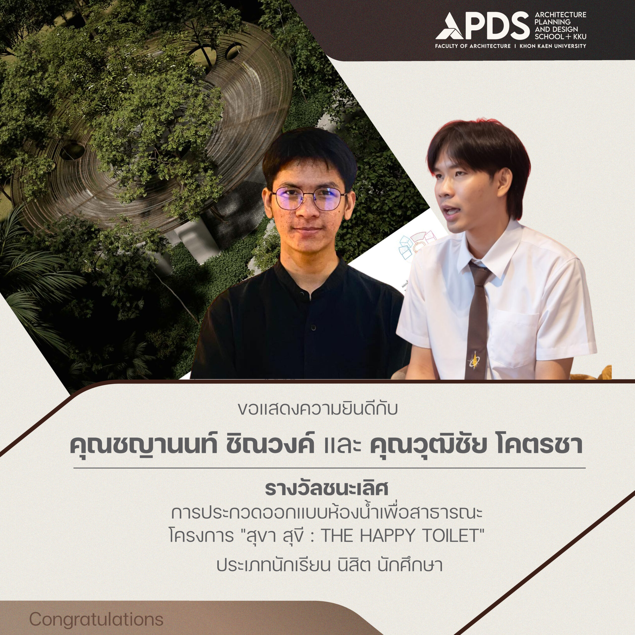 นักศึกษาคณะสถาปัตยกรรมศาสตร์ มหาวิทยาลัยขอนแก่น คว้ารางวัลชนะเลิศและรางวัลชมเชย จากการประกวดออกแบบห้องน้ำเพื่อสาธารณะ “สุขา สุขี The Happy Toilet” ท่ามกลางคู่แข่ง 683 ผลงานจากทั่วประเทศ ซึ่งประกาศผลการประกวดเมื่อวันที่ 16 มกราคม 2568 จัดโดย บริษัท แอสเซทไวส์ จำกัด (มหาชน)